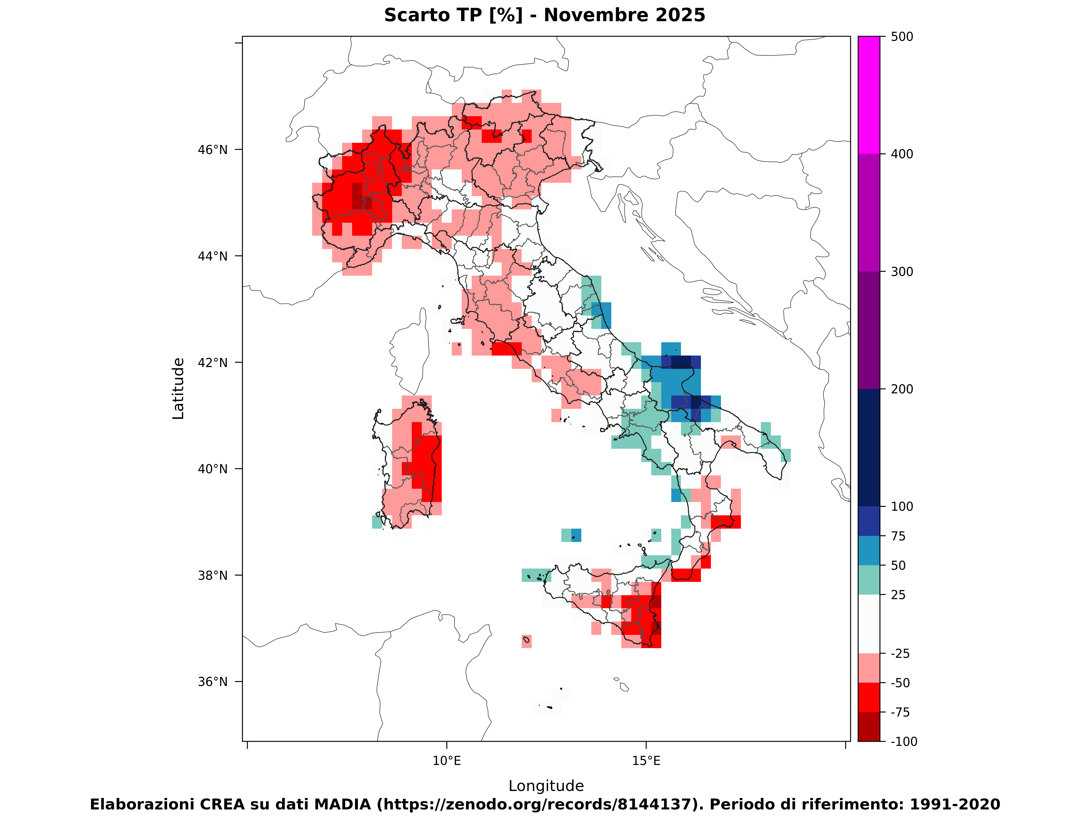 L’andamento agrometeorologico di novembre 2025“…le piogge cadute a novembre sono state diffusamente al di sotto della media a Nord-Ovest (-46%,) […] a Nord-Est (-33%), […] nelle Isole (-35%), […] al Centro (-16%); al contrario, al Sud le piogge hanno di poco superato la media (+11%)…”.Link: Pianeta PSR – L’andamento agrometeorologico di novembre 2025